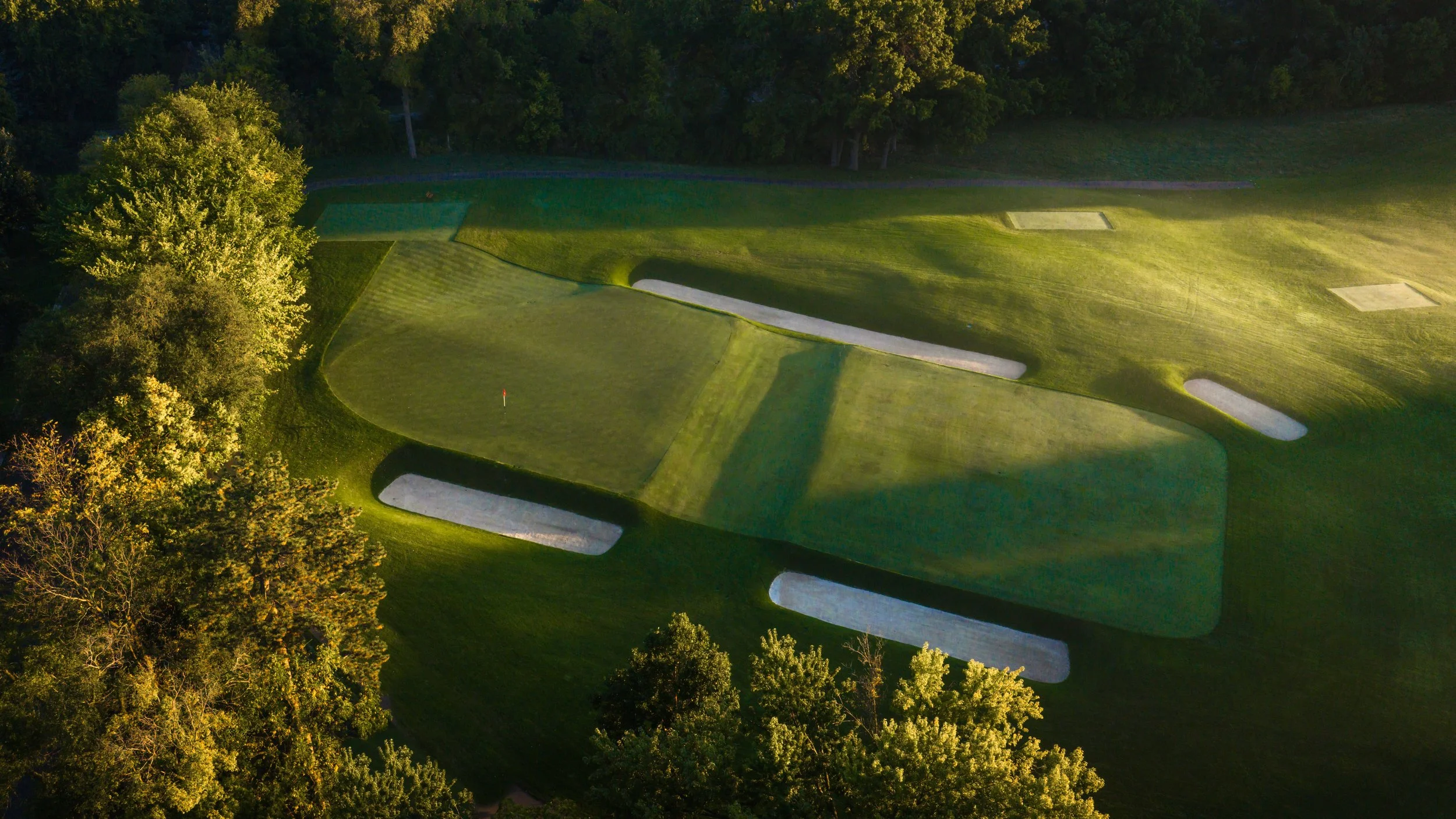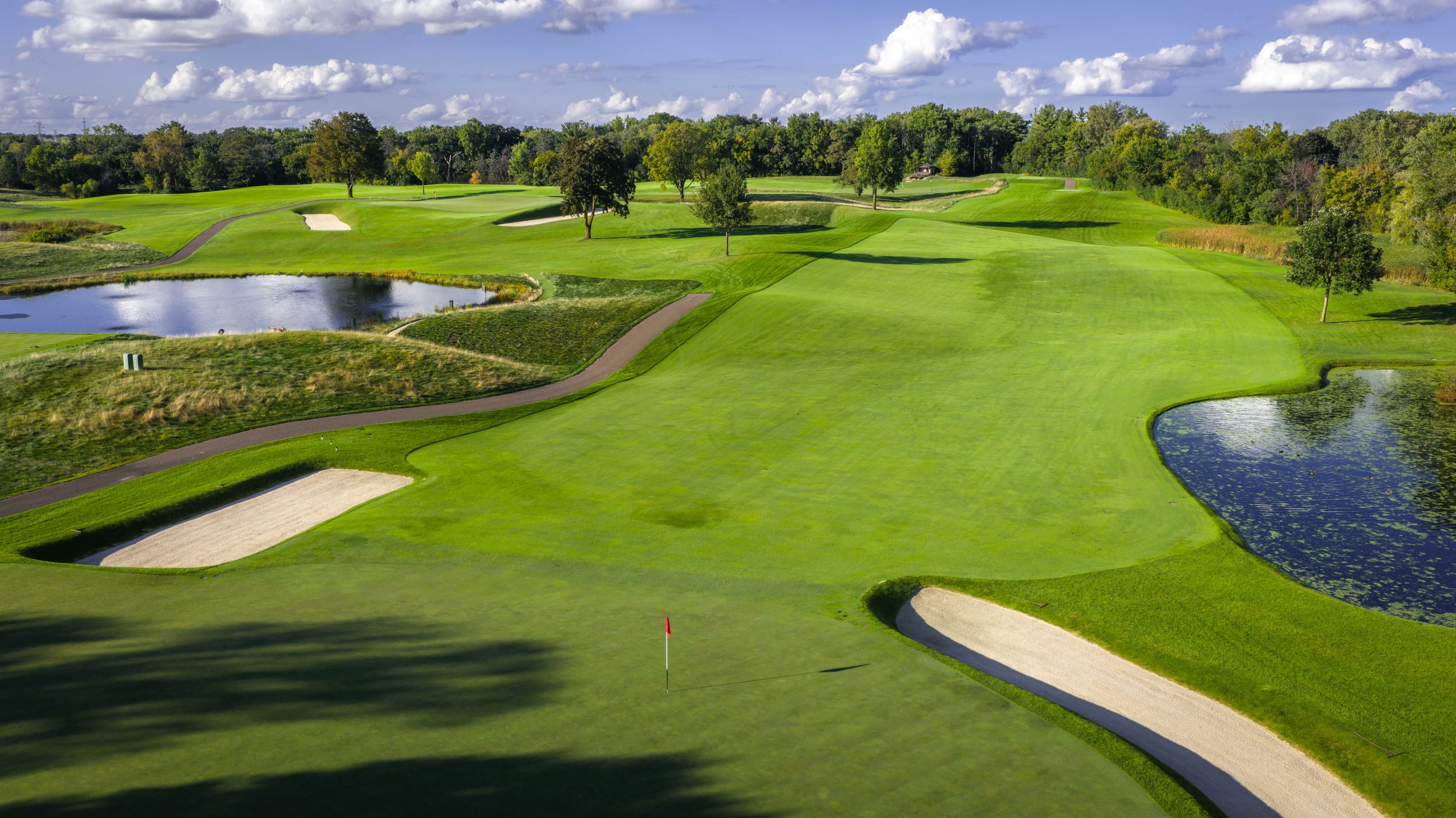 Another one of Midland’s flags is on display at the end of this long uphill par 4. The “Maiden” template originates from the 6th hole at Royal St George’s and refers to the green design alone. Large and undulating with humps in the back of the green, the Maiden template often resembles the Double Plateau. This particular green is one of the largest in the state of Minnesota.