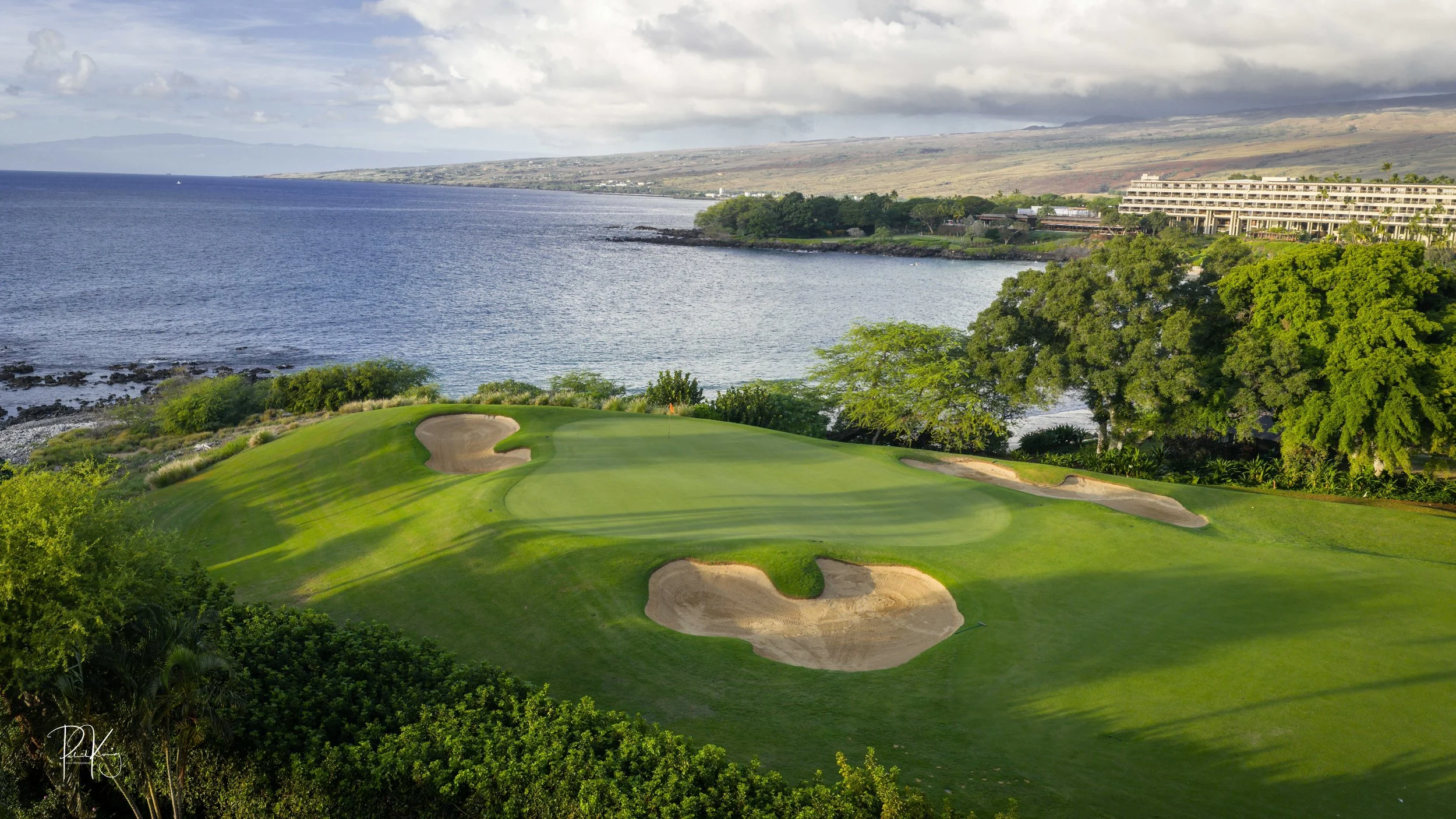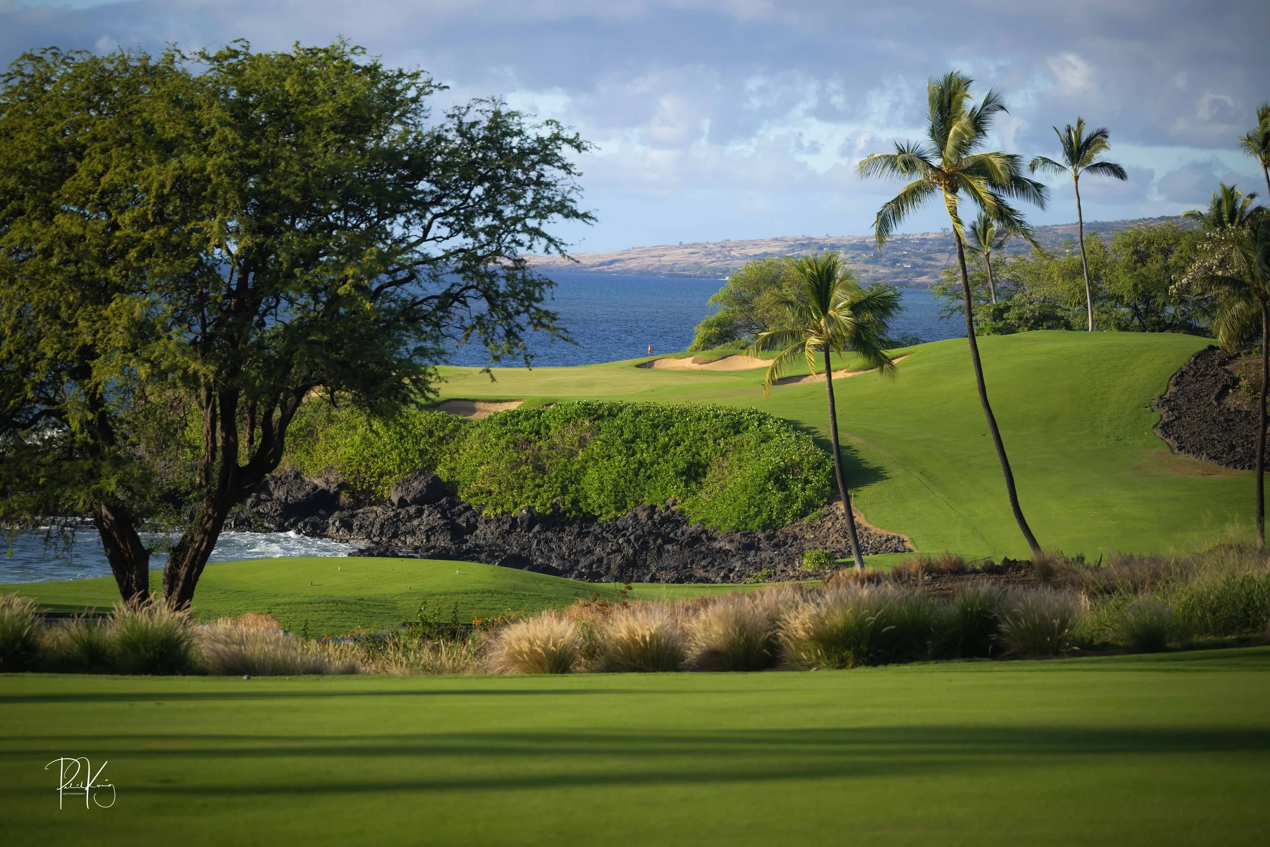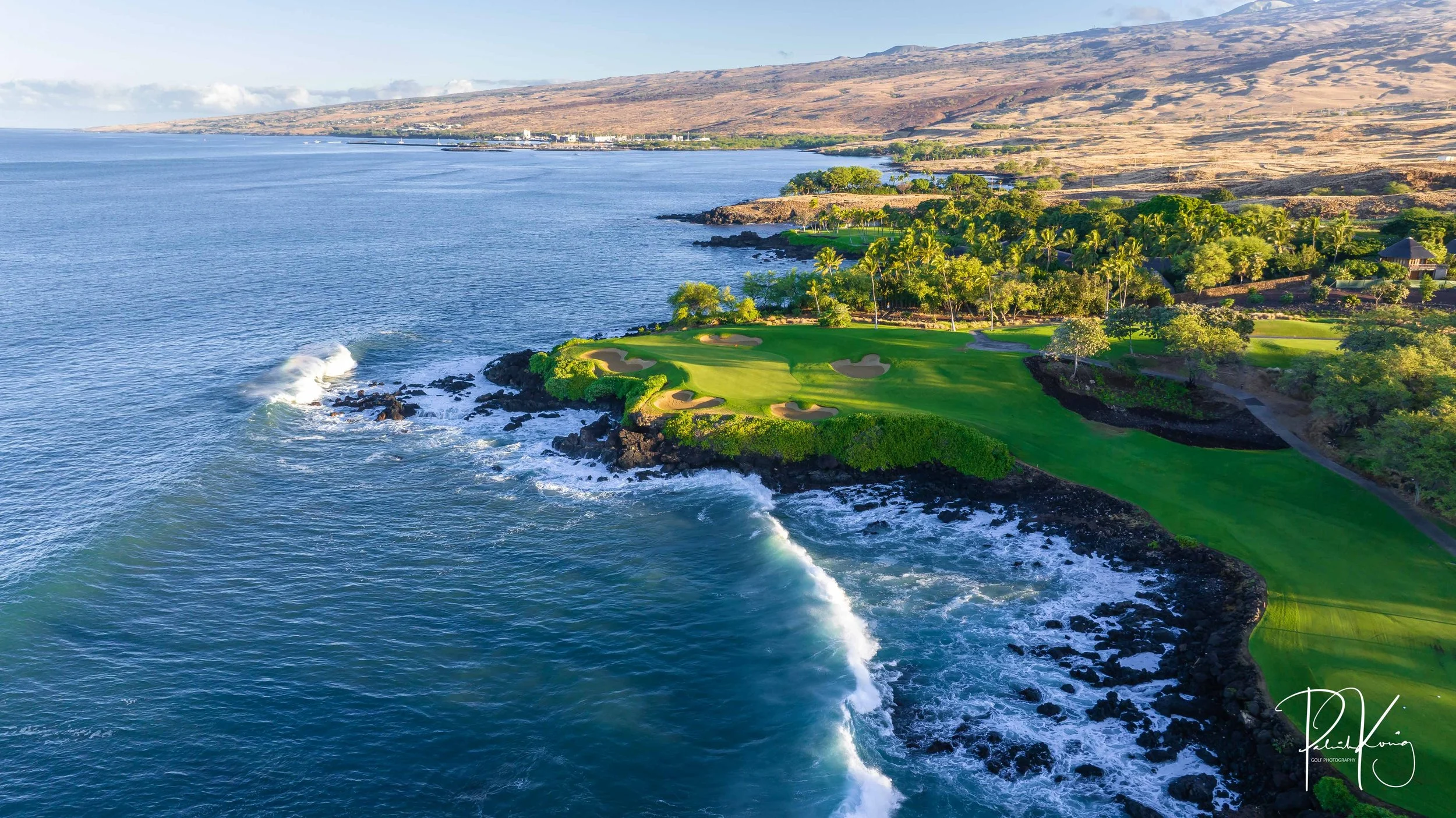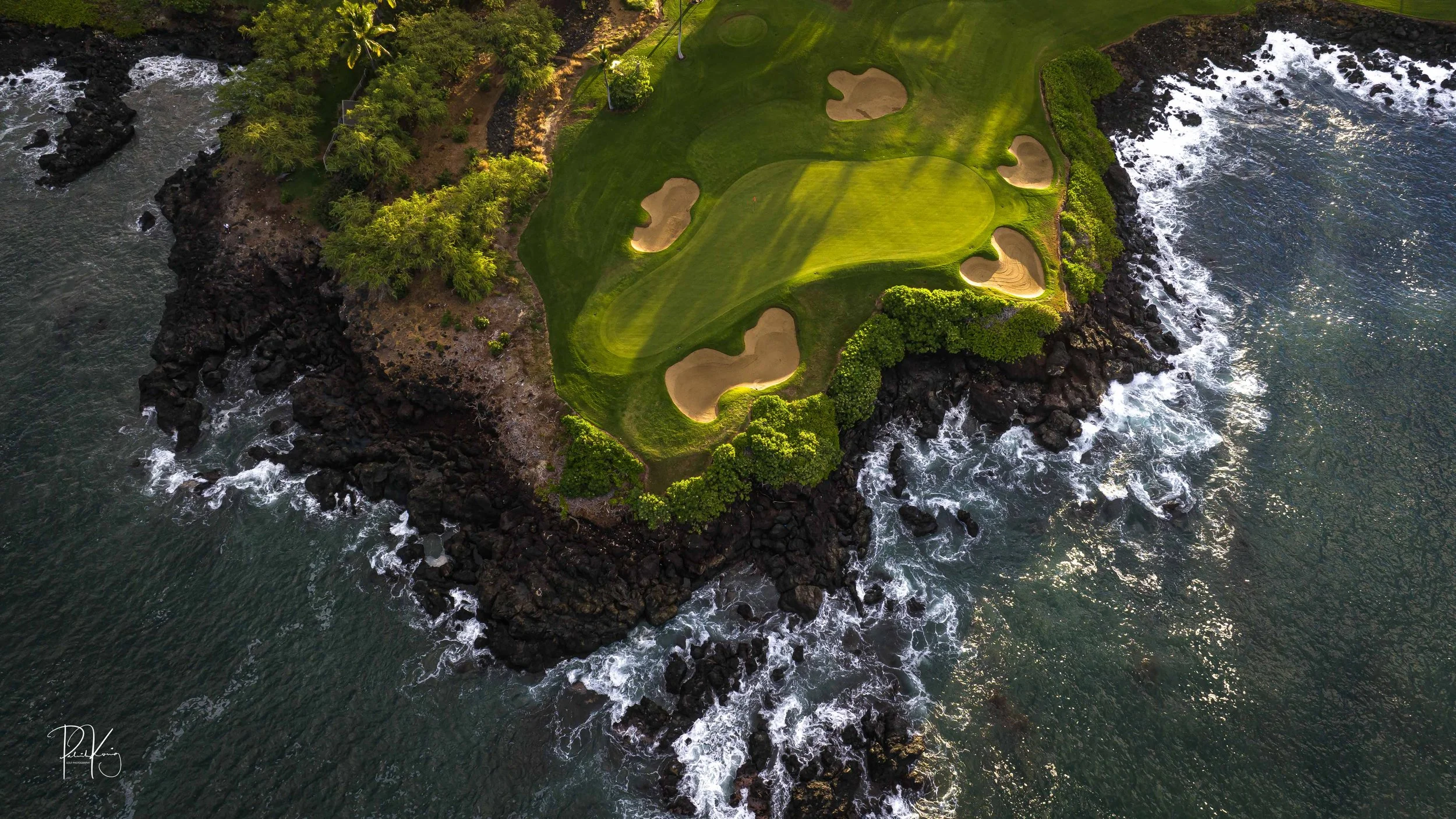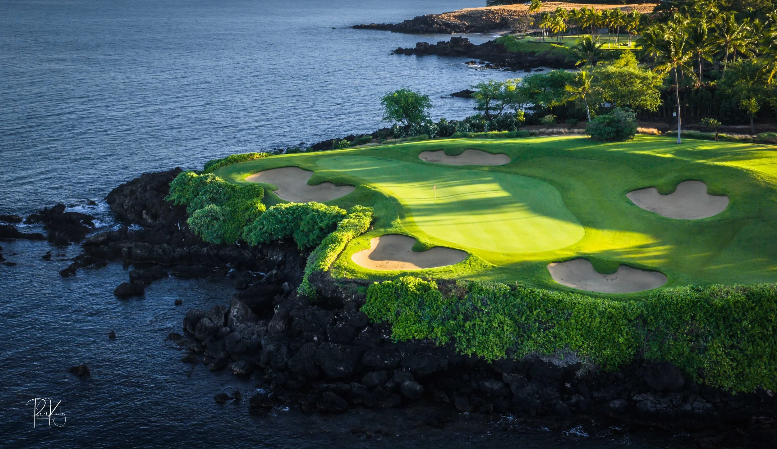 The 3rd hole is the signature hole at Mauna Kea and one of the grandest ocean side par 3’s in Hawaii. At 272 from the championship tees, the 3rd hole is also one of the longest carries over the ocean in golf. Almost no one plays the back tees unless you want to ensure a donation to the sea serpents. Most golfers will play 180 yards over the ocean to a large green. Finding the green here always feels like a grand sense of accomplishment. As this is one of the most scenic golf holes in Hawaii, I am including an unprecedented 16 images of this golf hole. This hole is a stunner.