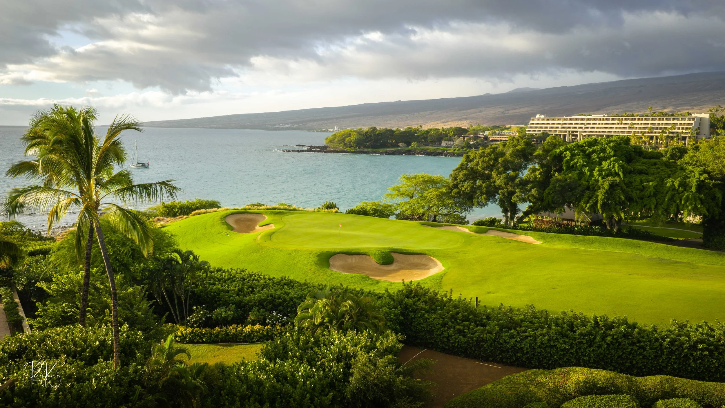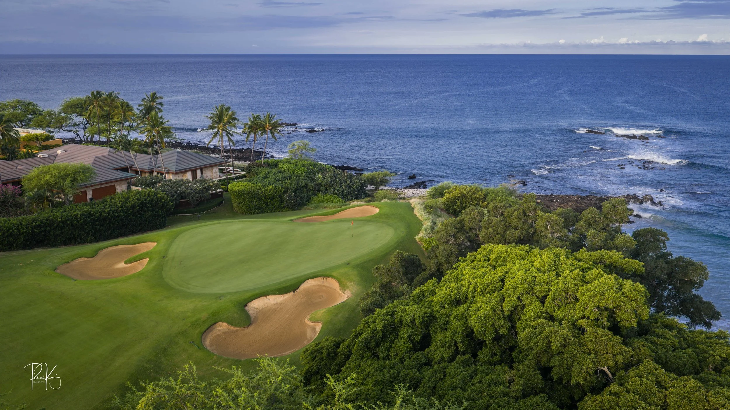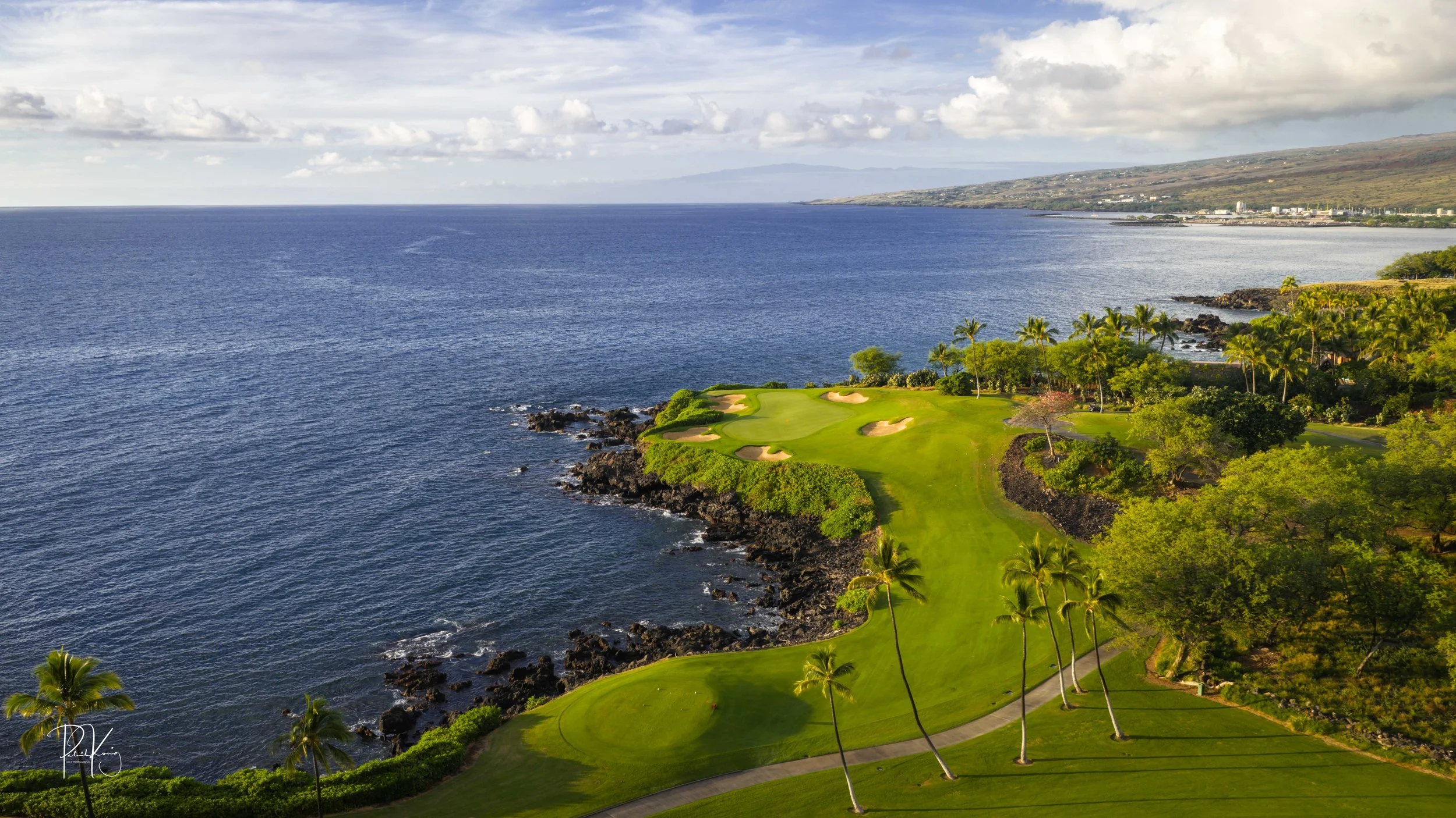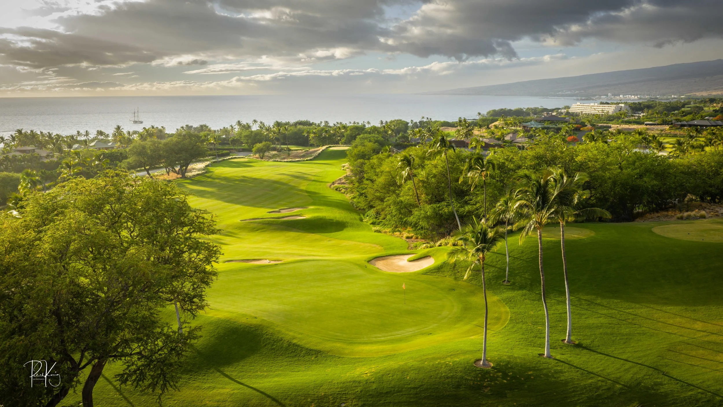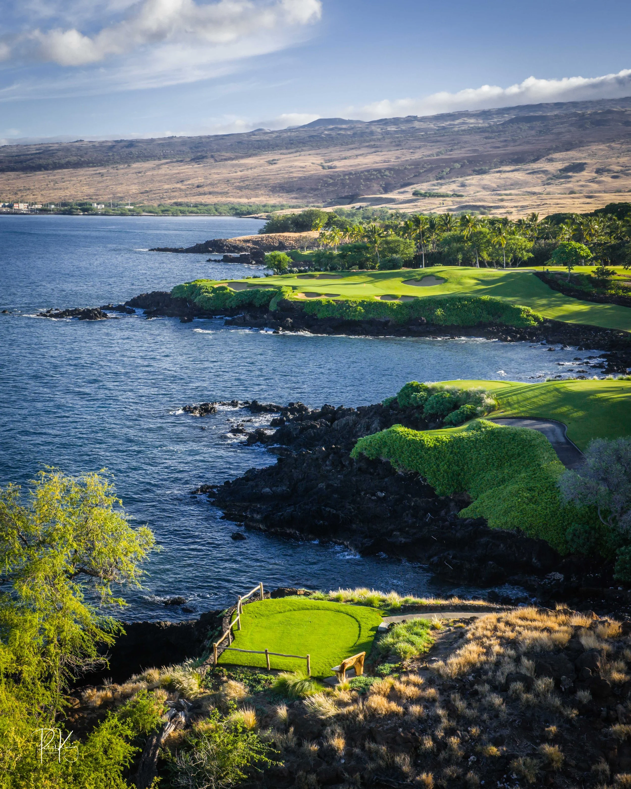 The 3rd hole is the signature hole at Mauna Kea and one of the grandest ocean side par 3’s in Hawaii. At 272 from the championship tees, the 3rd hole is also one of the longest carries over the ocean in golf. Almost no one plays the back tees unless you want to ensure a donation to the sea serpents. Most golfers will play 180 yards over the ocean to a large green. Finding the green here always feels like a grand sense of accomplishment. As this is one of the most scenic golf holes in Hawaii, I am including an unprecedented 16 images of this golf hole. This hole is a stunner.
