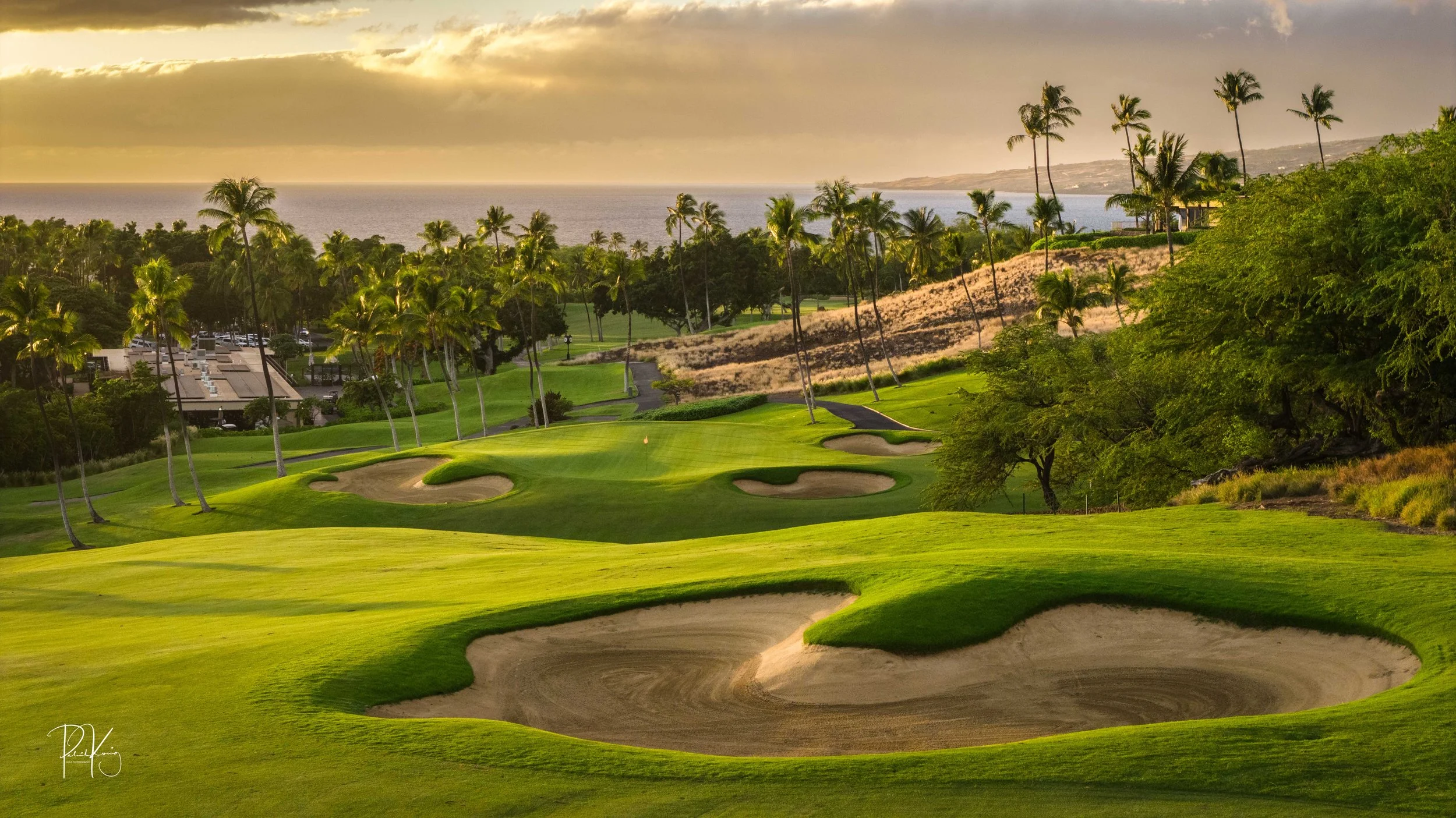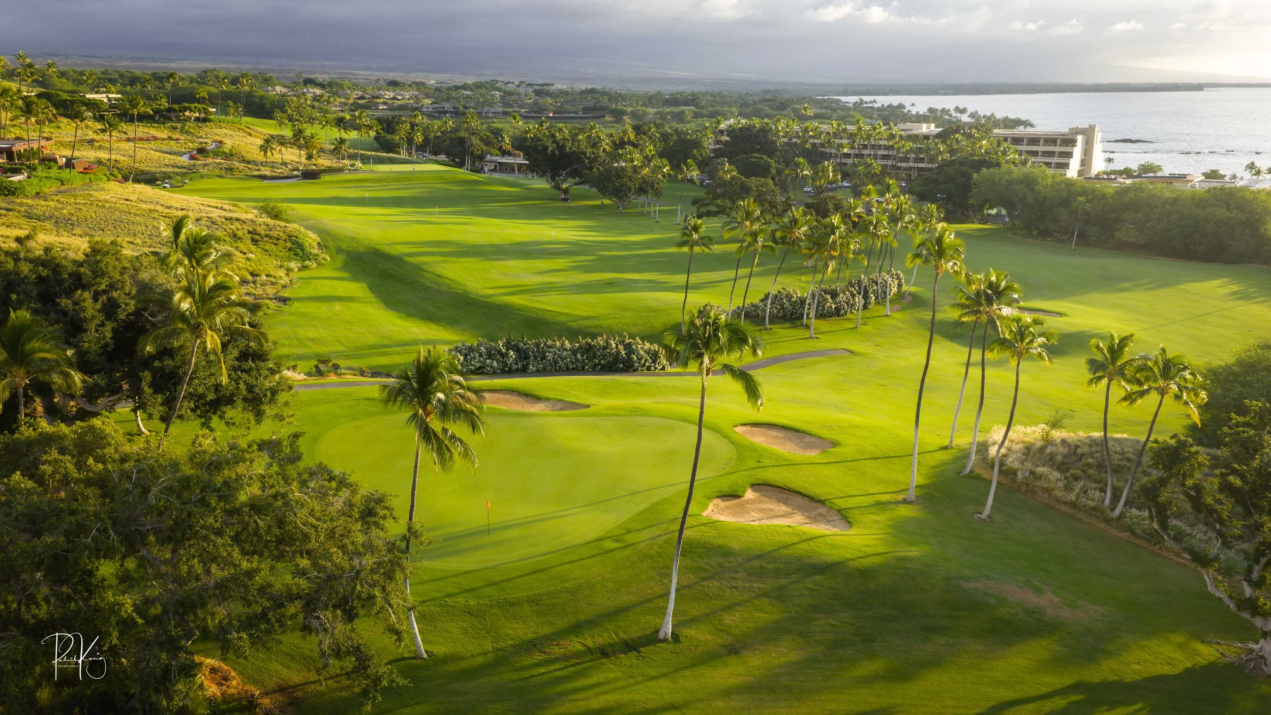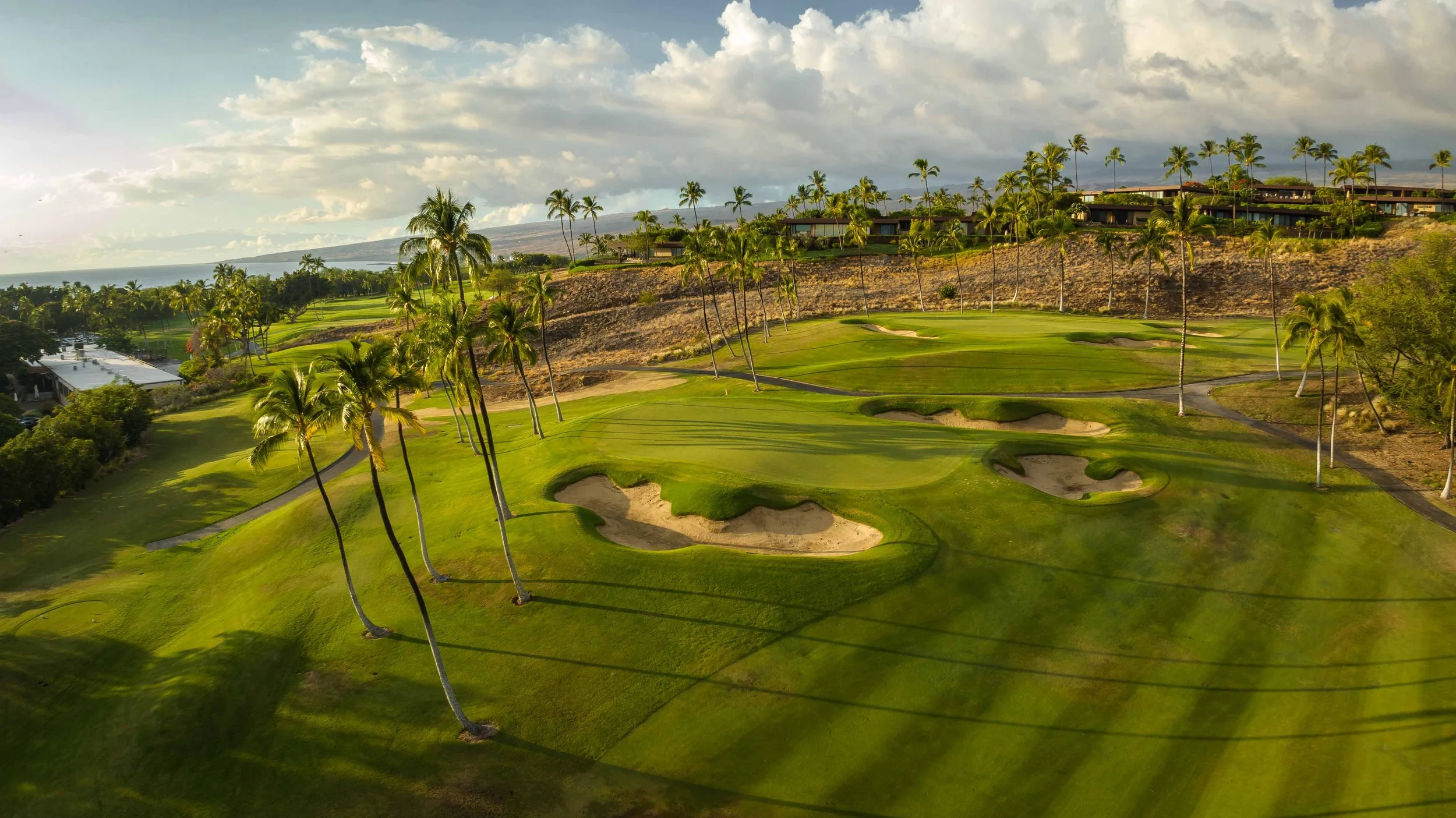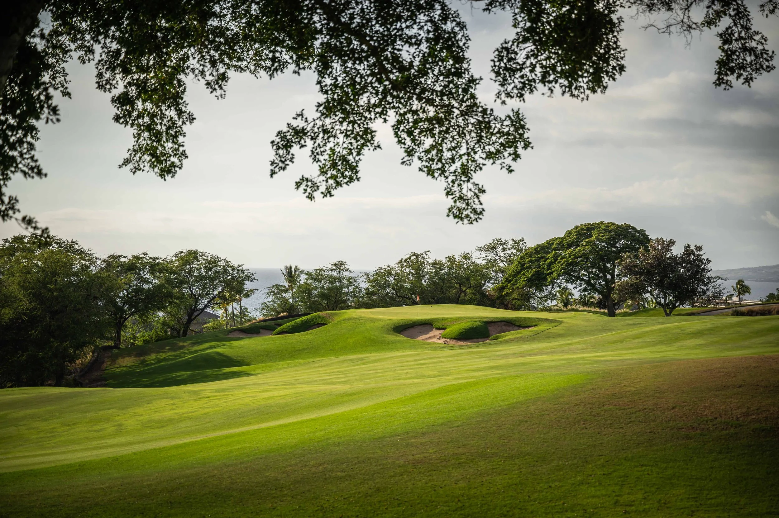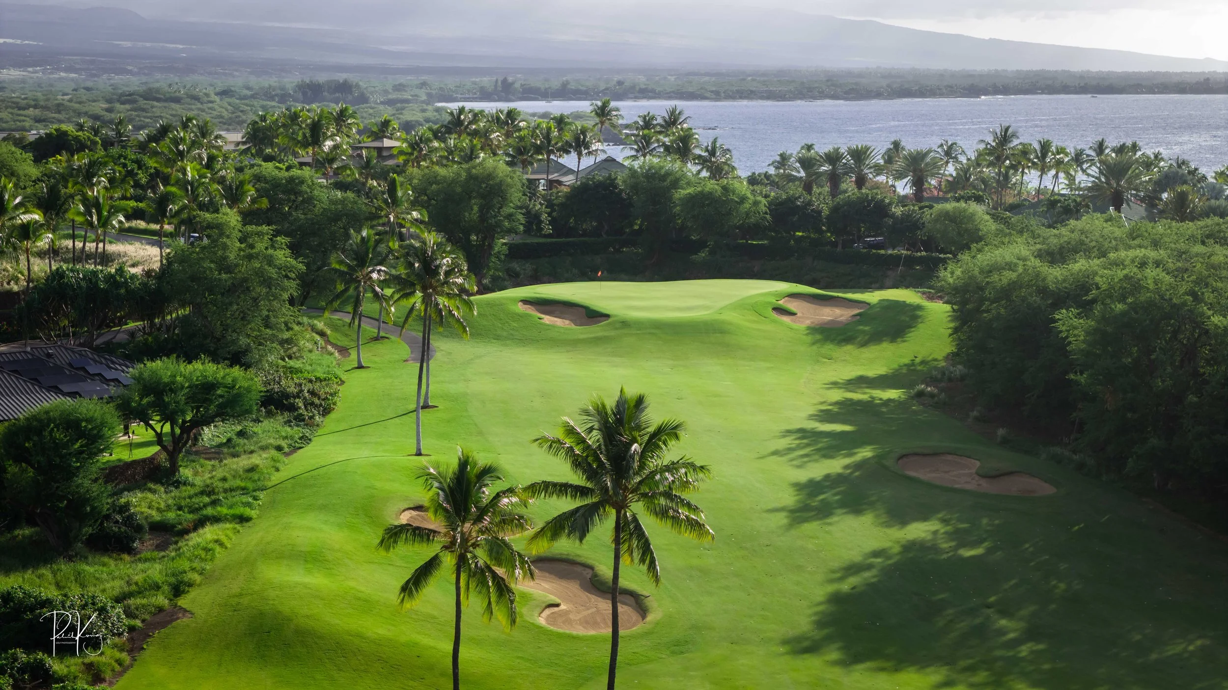 The front nine finishes with a fun downhill par 4 and sweeping views of the ocean and Mauna Kea resort. With the entire golf hole sloping down and towards the ocean, the 9th plays much shorter than the scorecard suggest. The green is also well protected with a trio of bunkers. A quick look to the left and you will get a preview of the 18th green which sits right next to the 9th hole. Any wise golfer will take a peak at the pin location and the slope of the green. A good mental note can come in handy when assessing your upcoming approach into 18.