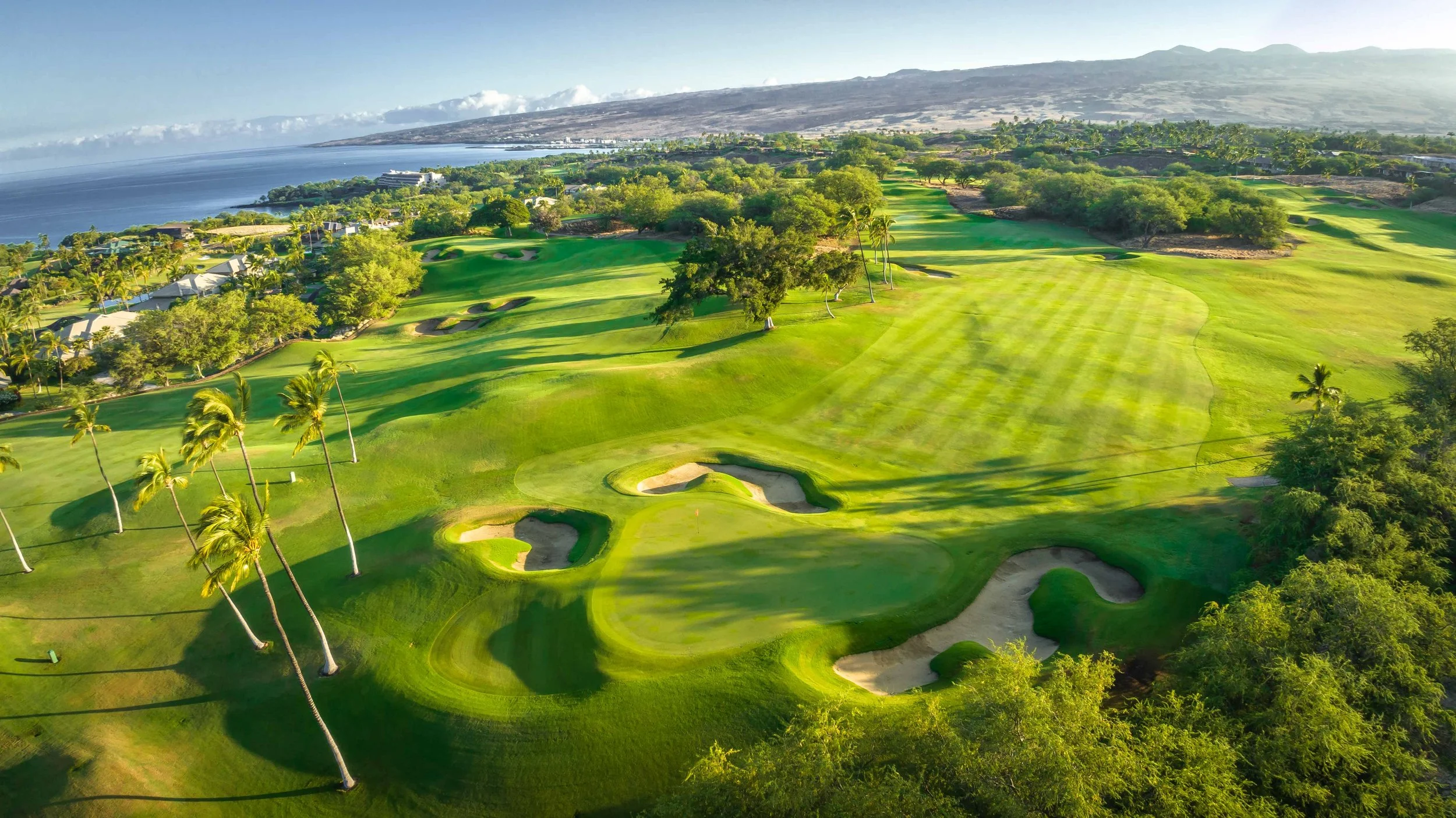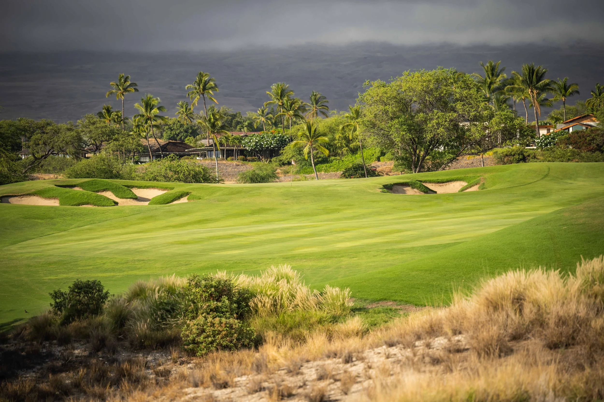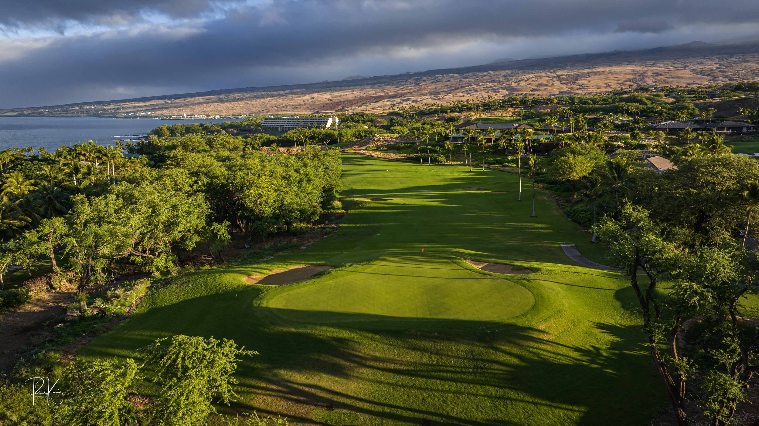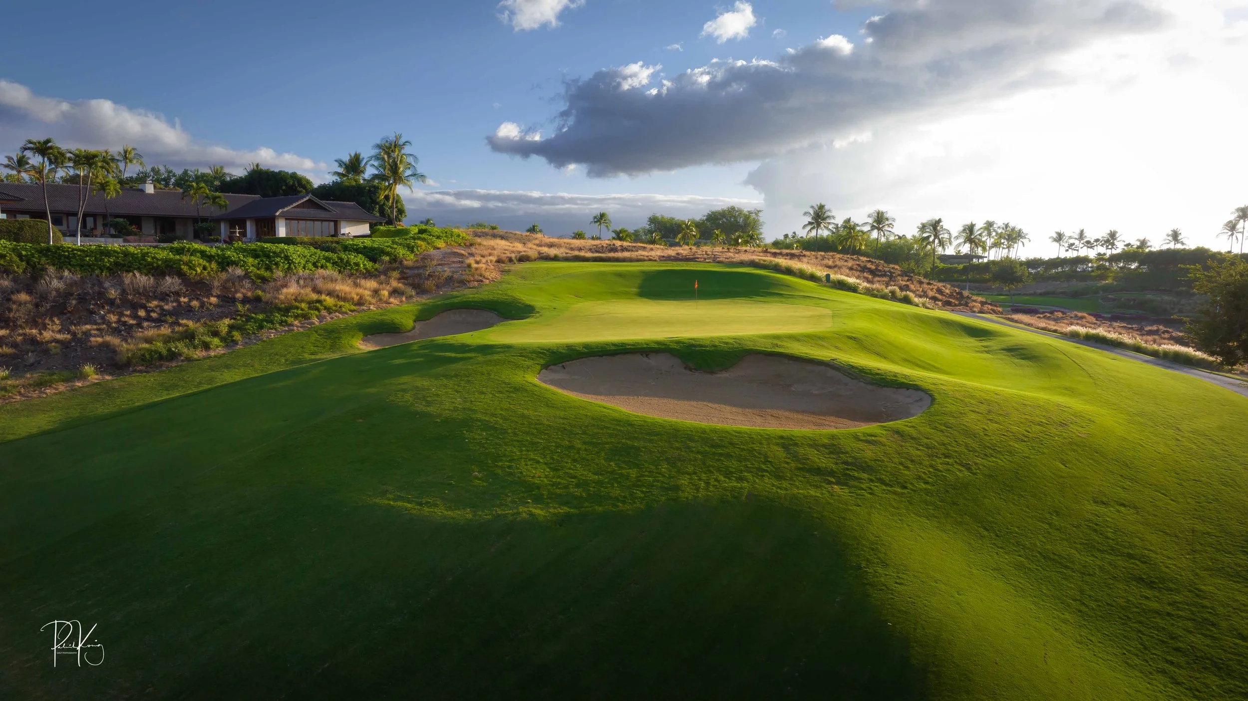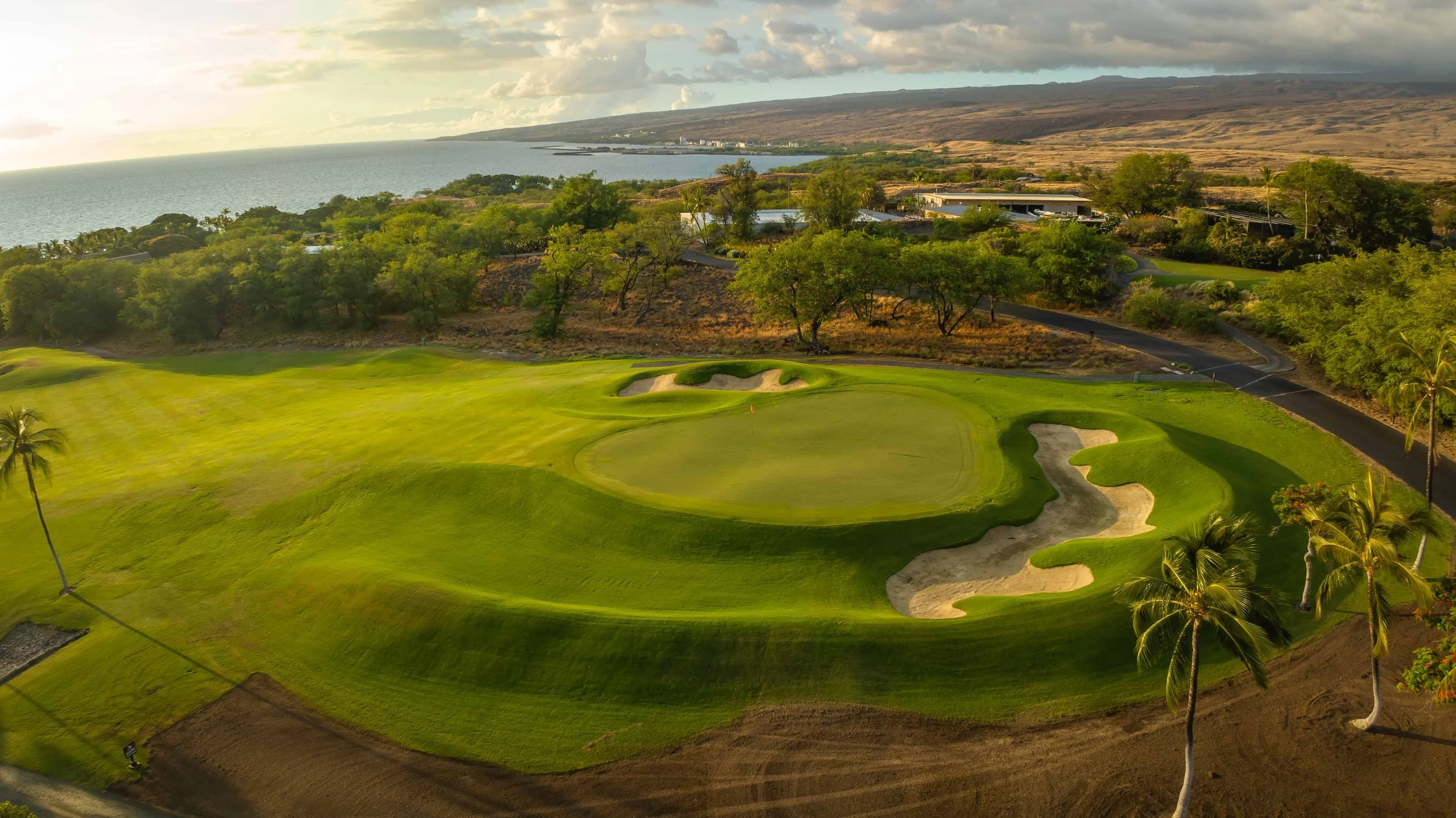 The front nine finishes with a fun downhill par 4 and sweeping views of the ocean and Mauna Kea resort. With the entire golf hole sloping down and towards the ocean, the 9th plays much shorter than the scorecard suggest. The green is also well protected with a trio of bunkers. A quick look to the left and you will get a preview of the 18th green which sits right next to the 9th hole. Any wise golfer will take a peak at the pin location and the slope of the green. A good mental note can come in handy when assessing your upcoming approach into 18.