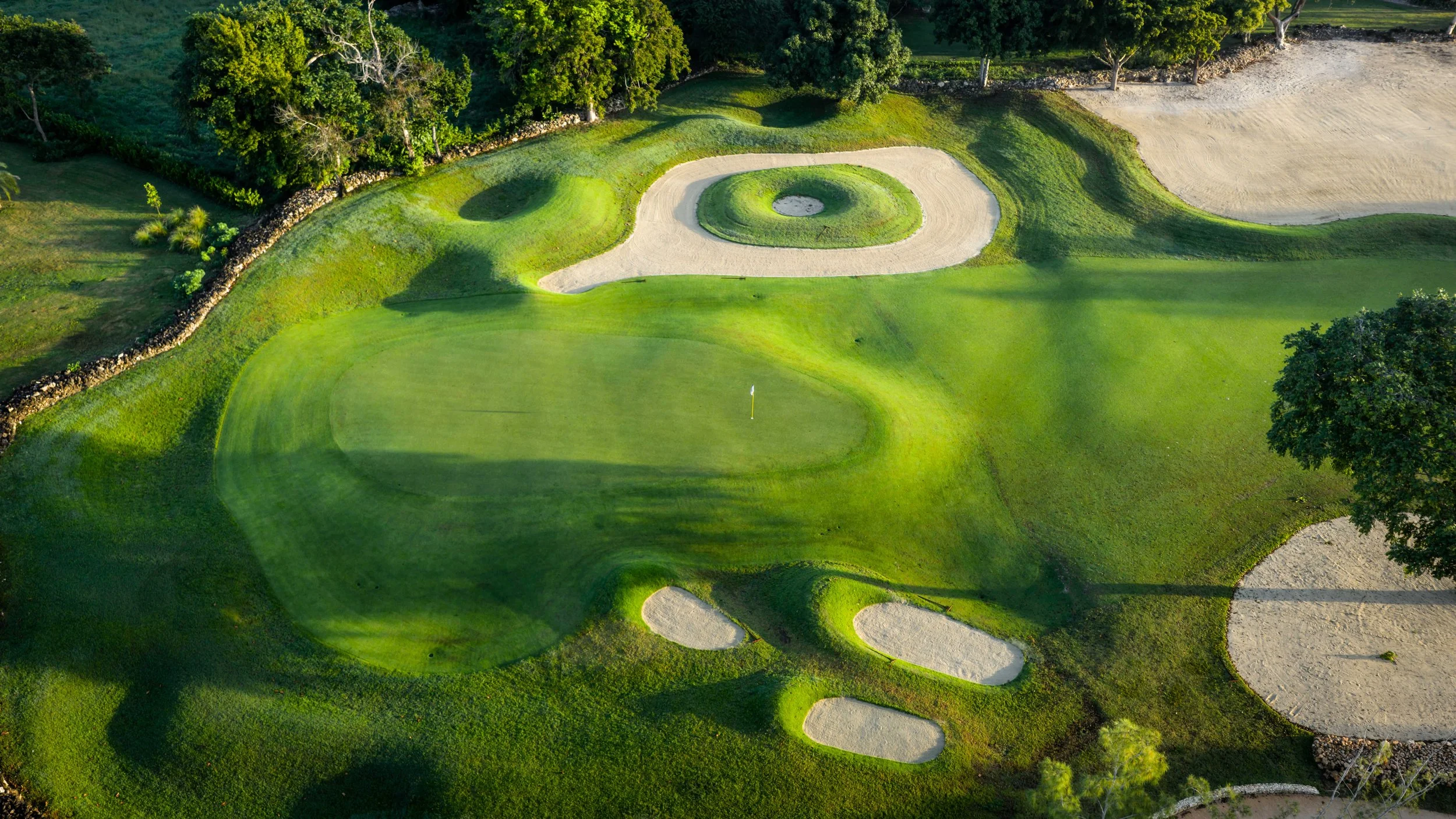 The back nine begins its outward journey with a manageable par 4. This slight dogleg left plays around a large bunker and over an old stone sugarcane trench that bisects the fairway. Like many of the golf holes at Teeth of the Dog, the most interesting part of the 10th hole is the green. It rises significantly from its surroundings and has four uniquely shaped bunkers protecting the surface.