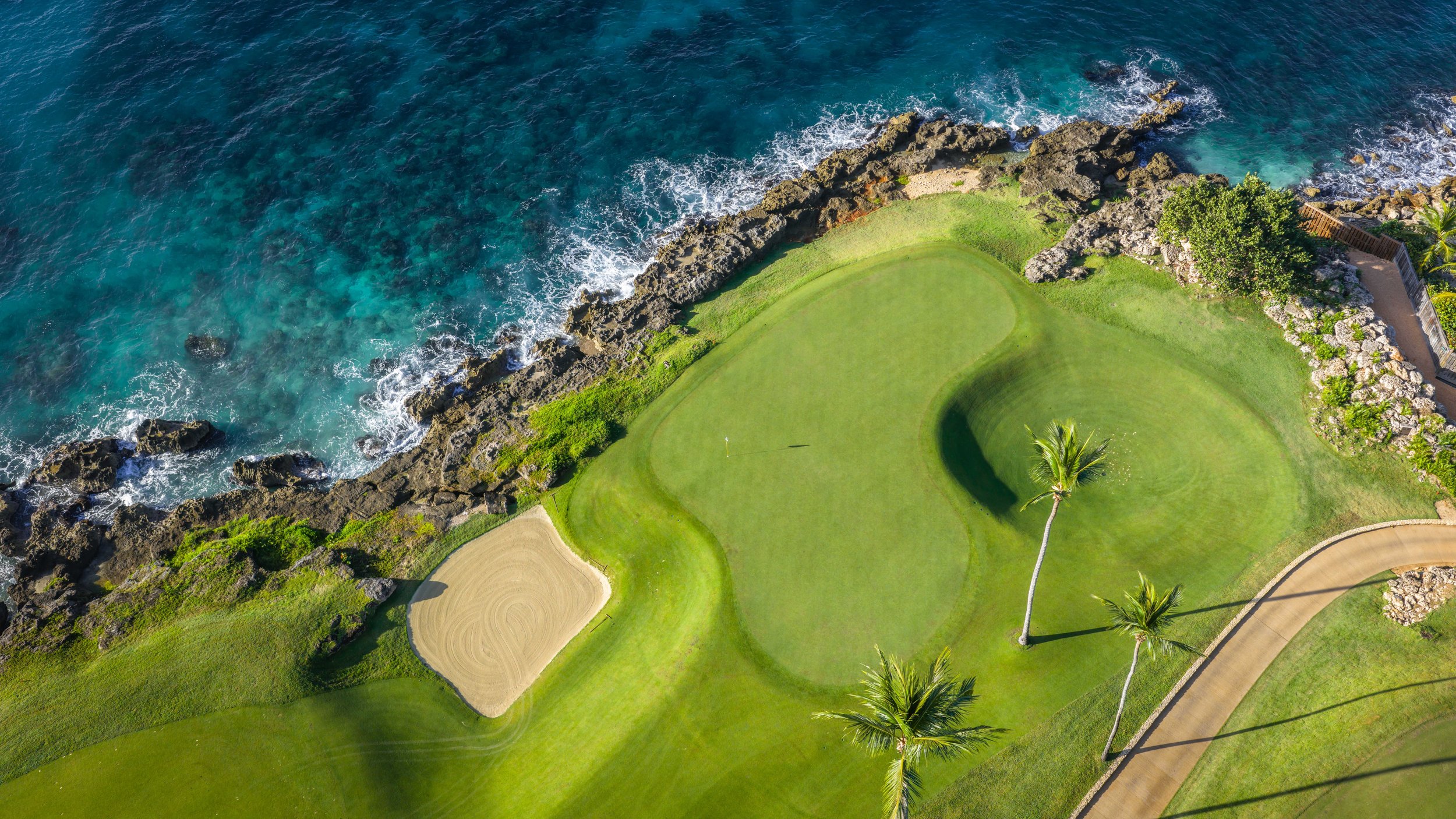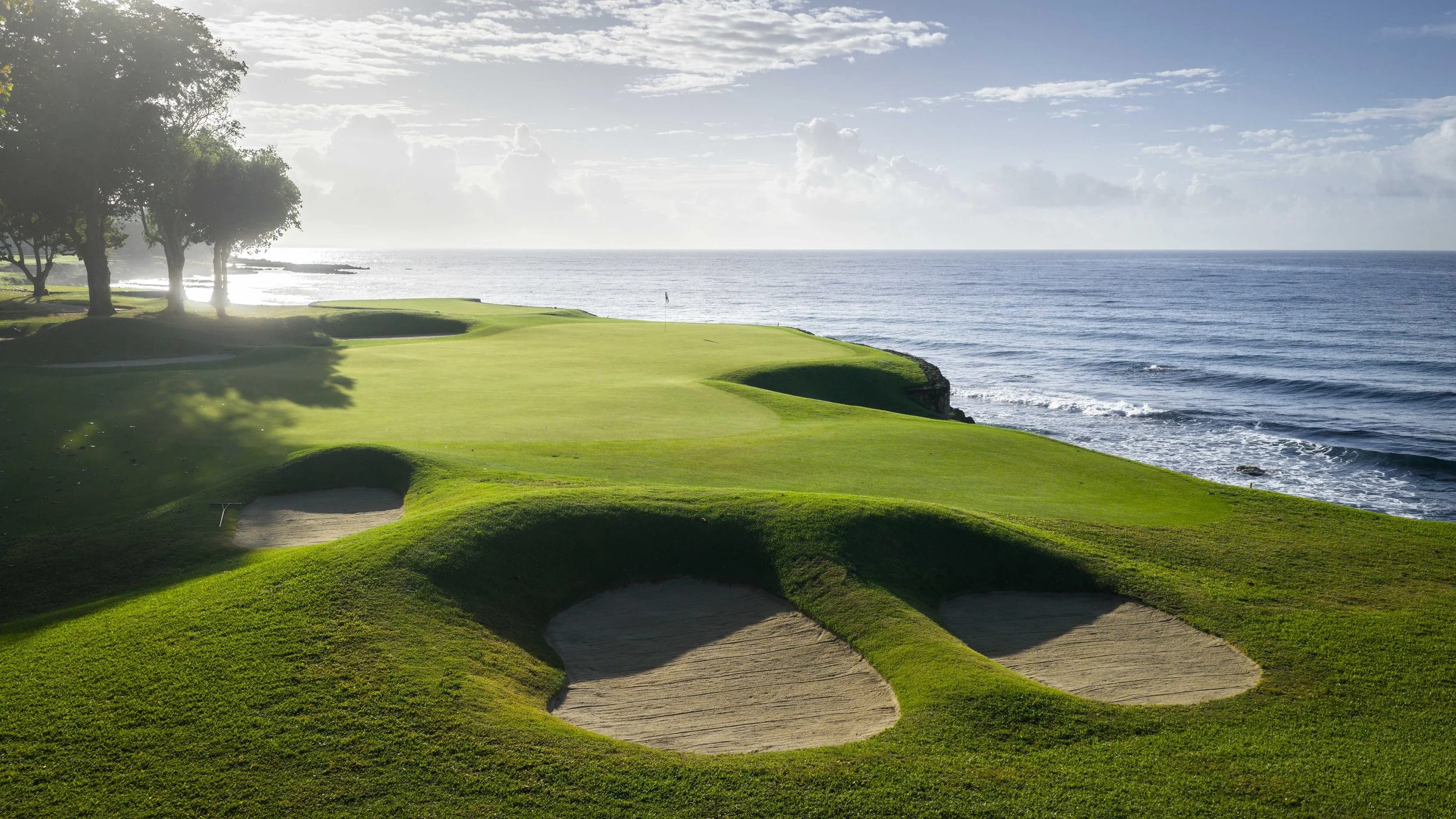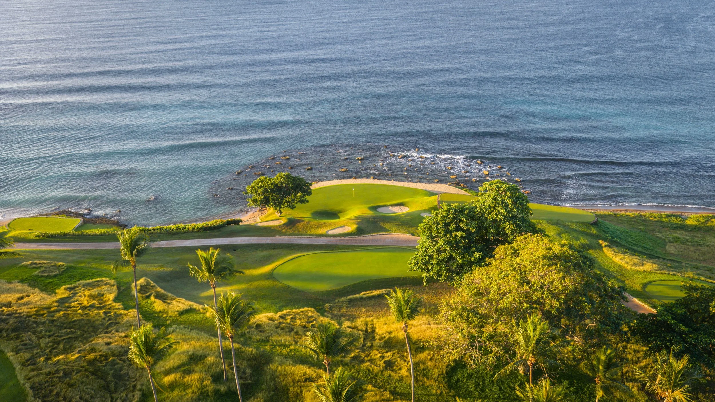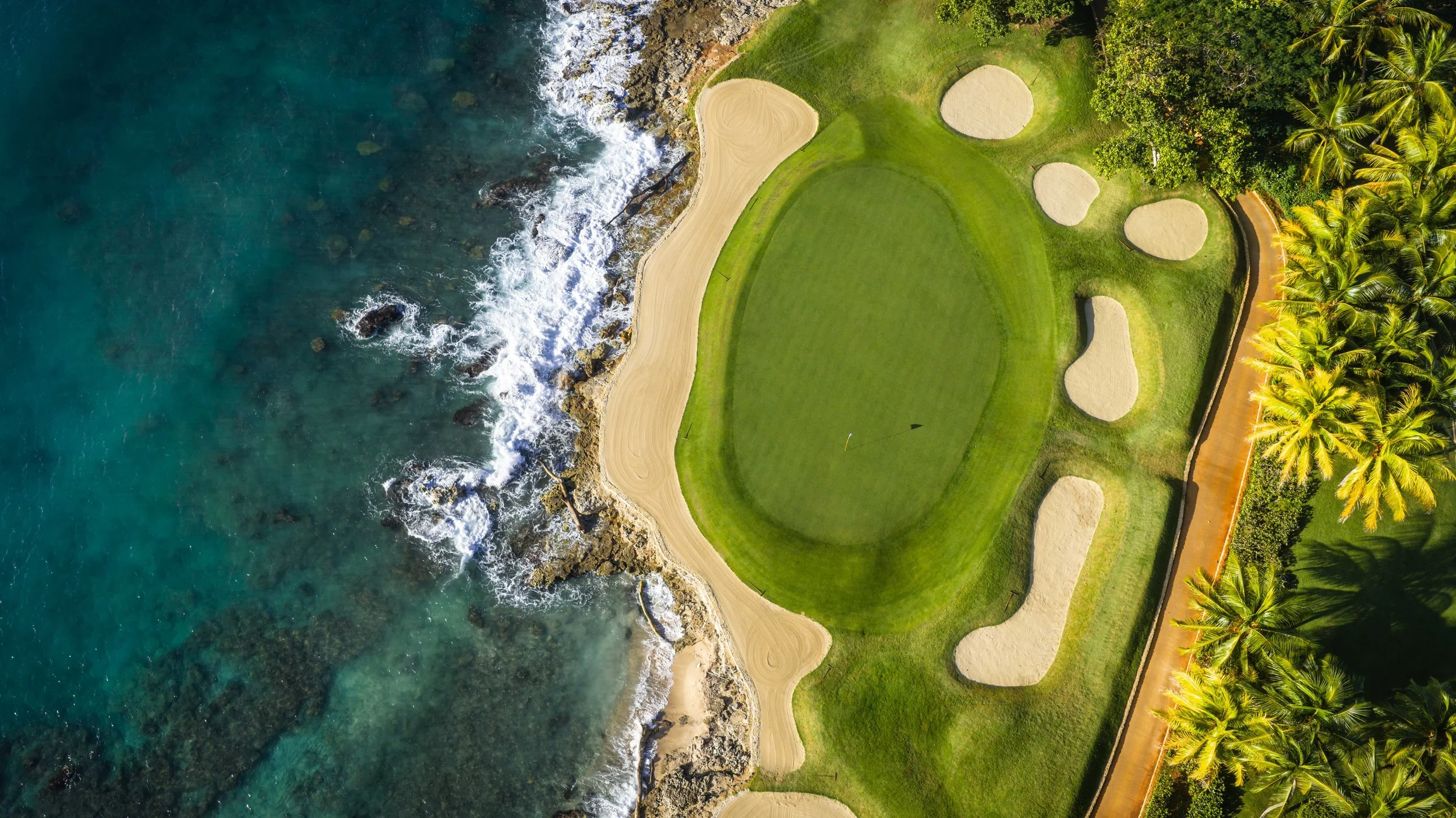 A short walk beyond the 5th green is the glorious 6th tee box. The new tee boxes have been shuffled around to provide an even more dramatic tee shot down the coastline. You can bail out to the right, but that only makes your approach shot more difficult. The green has a beautiful smattering of palm trees that can provide some interest to any golf shot that doesn’t find the putting surface.