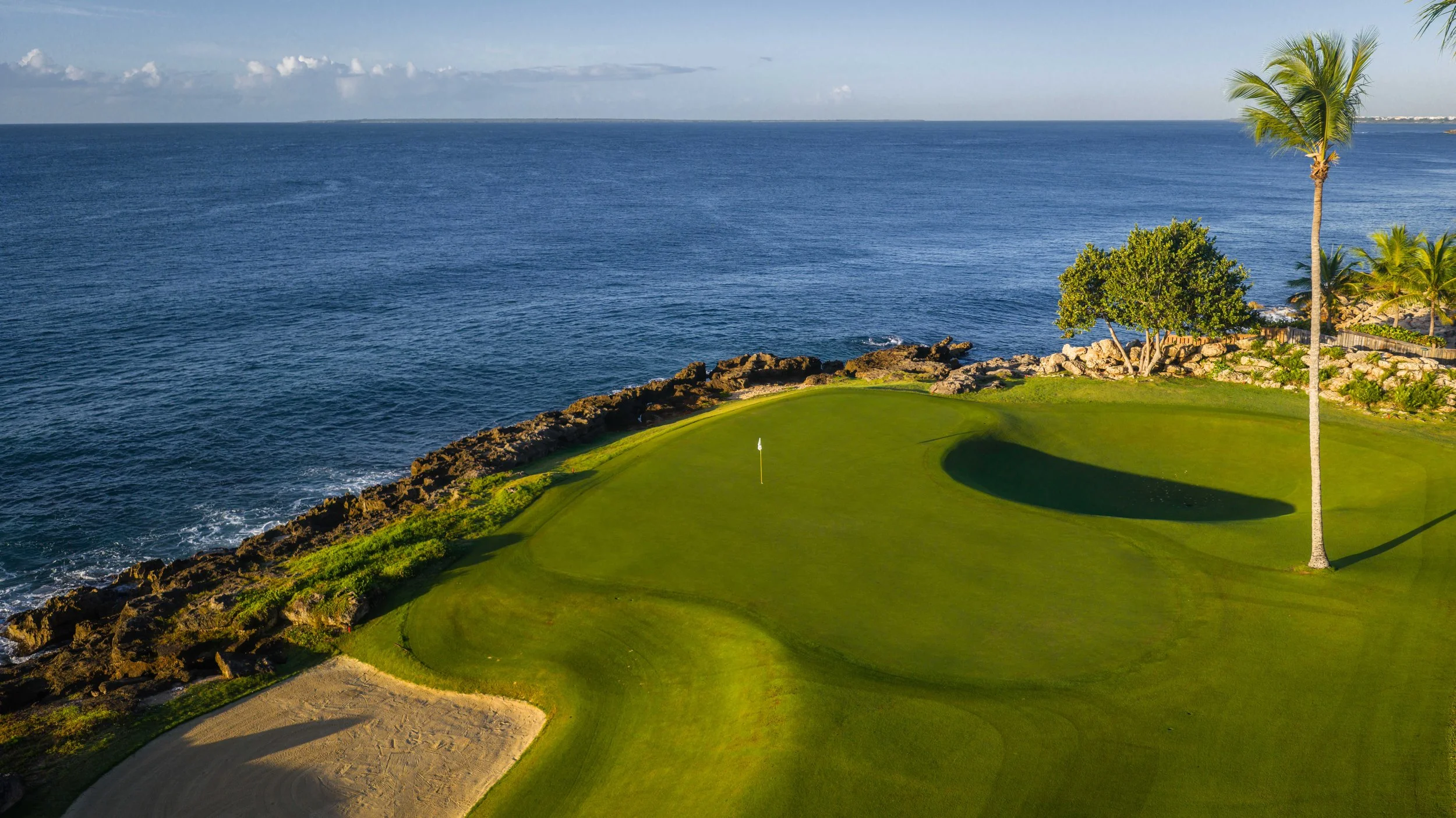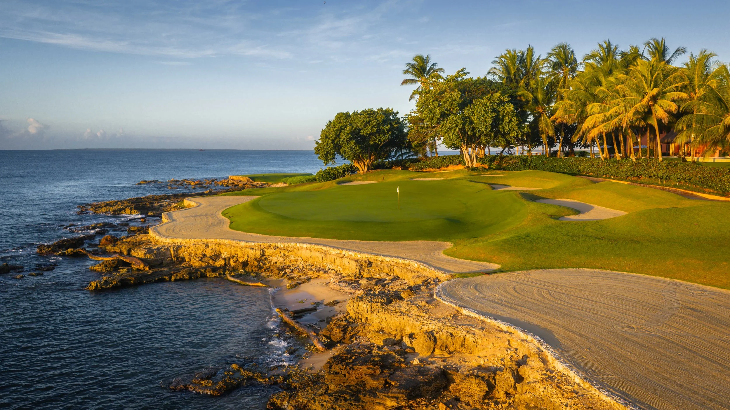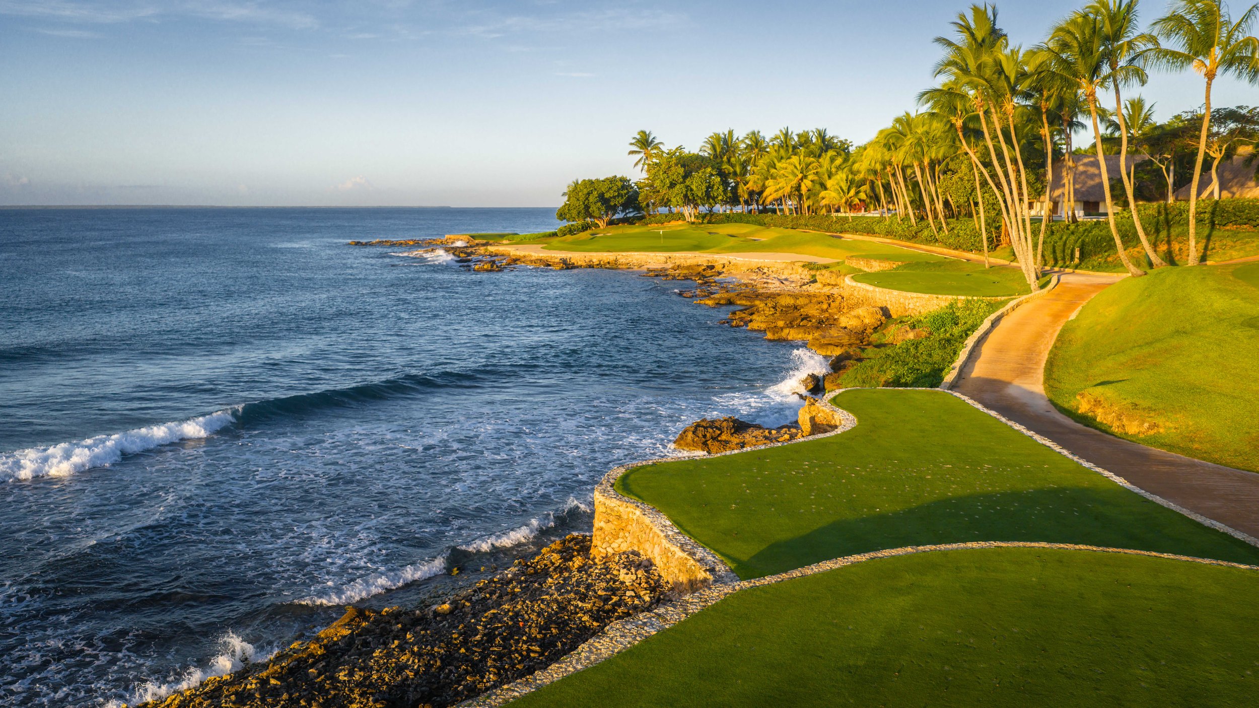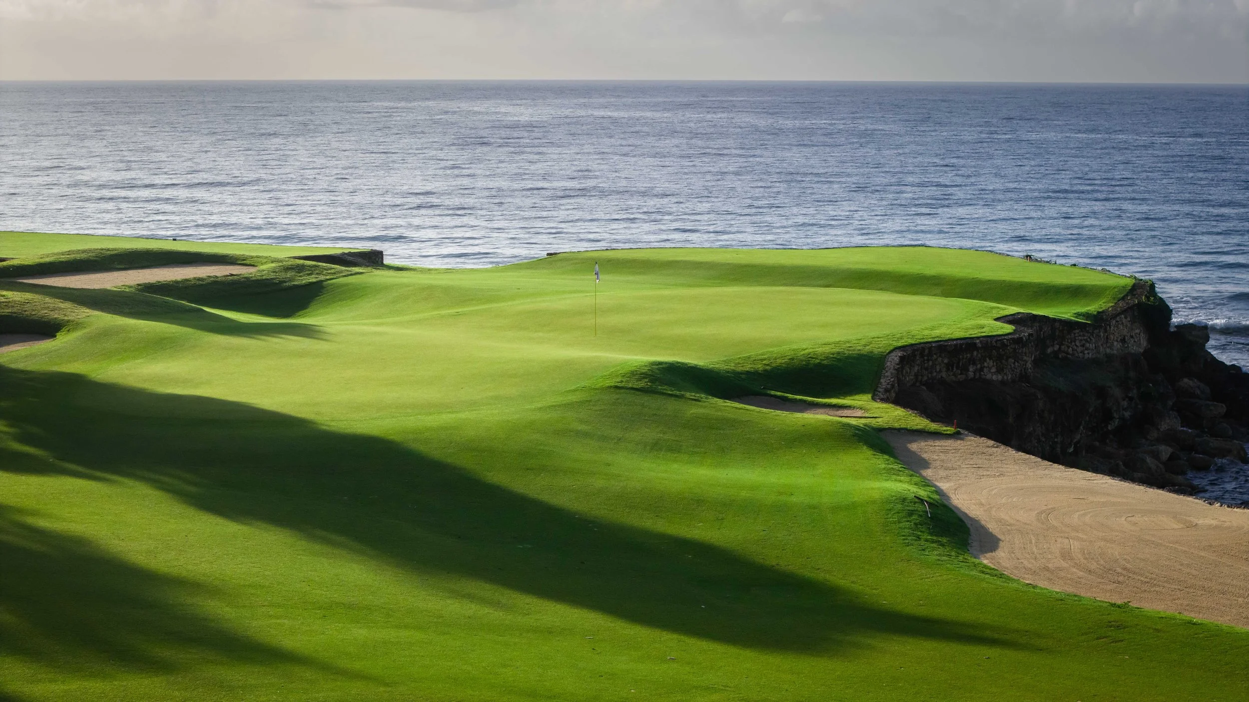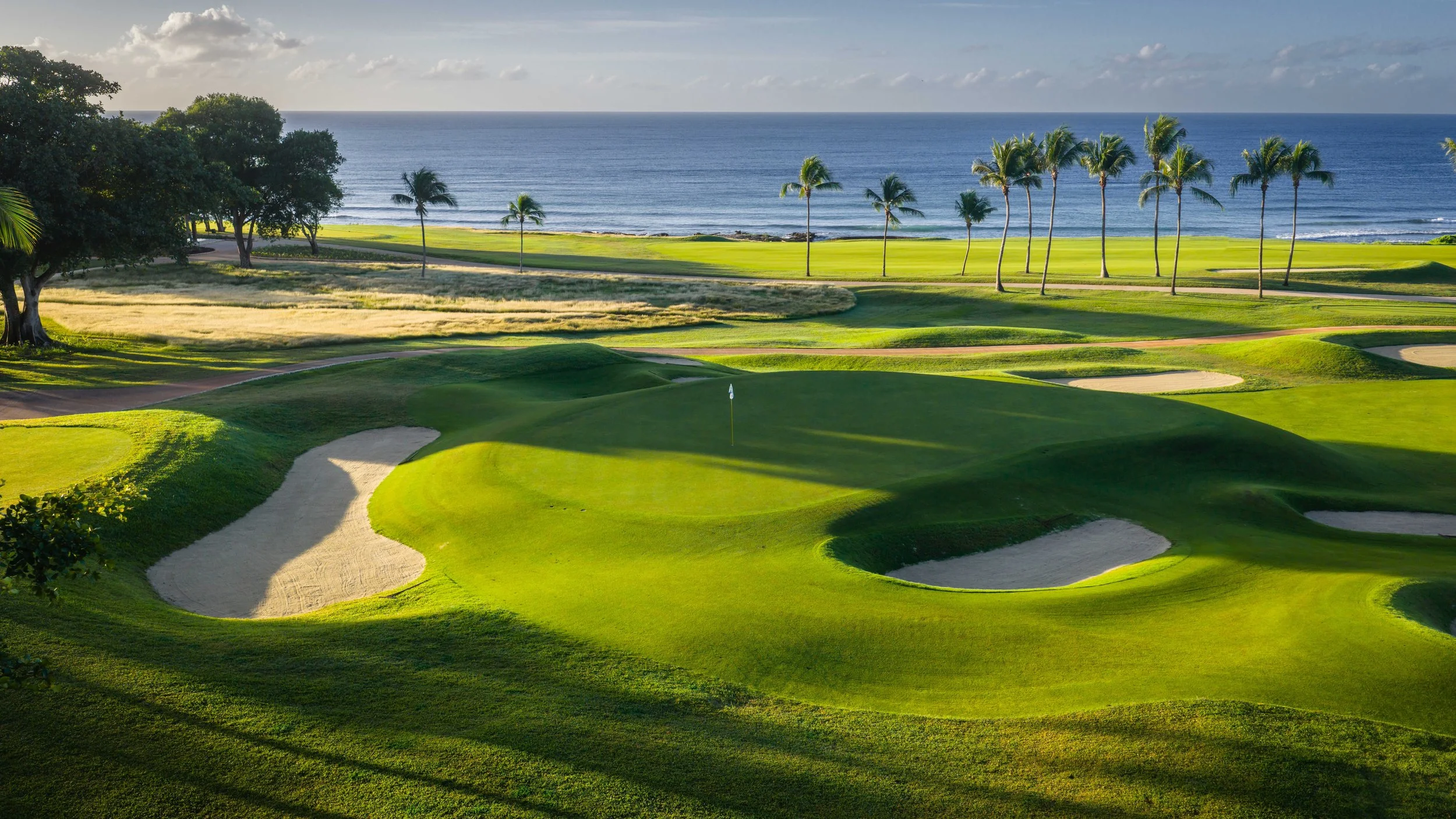 A short walk beyond the 5th green is the glorious 6th tee box. The new tee boxes have been shuffled around to provide an even more dramatic tee shot down the coastline. You can bail out to the right, but that only makes your approach shot more difficult. The green has a beautiful smattering of palm trees that can provide some interest to any golf shot that doesn’t find the putting surface.