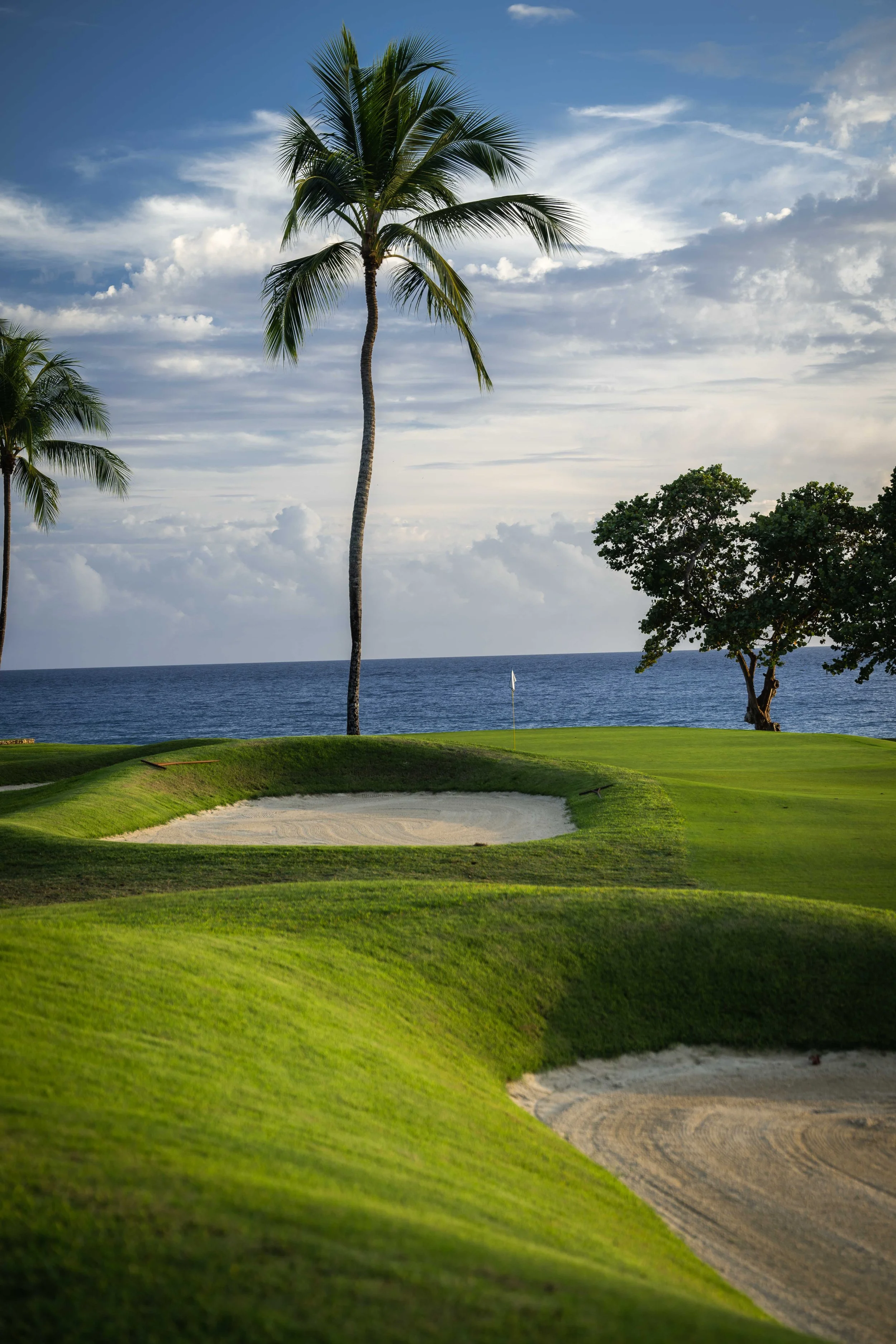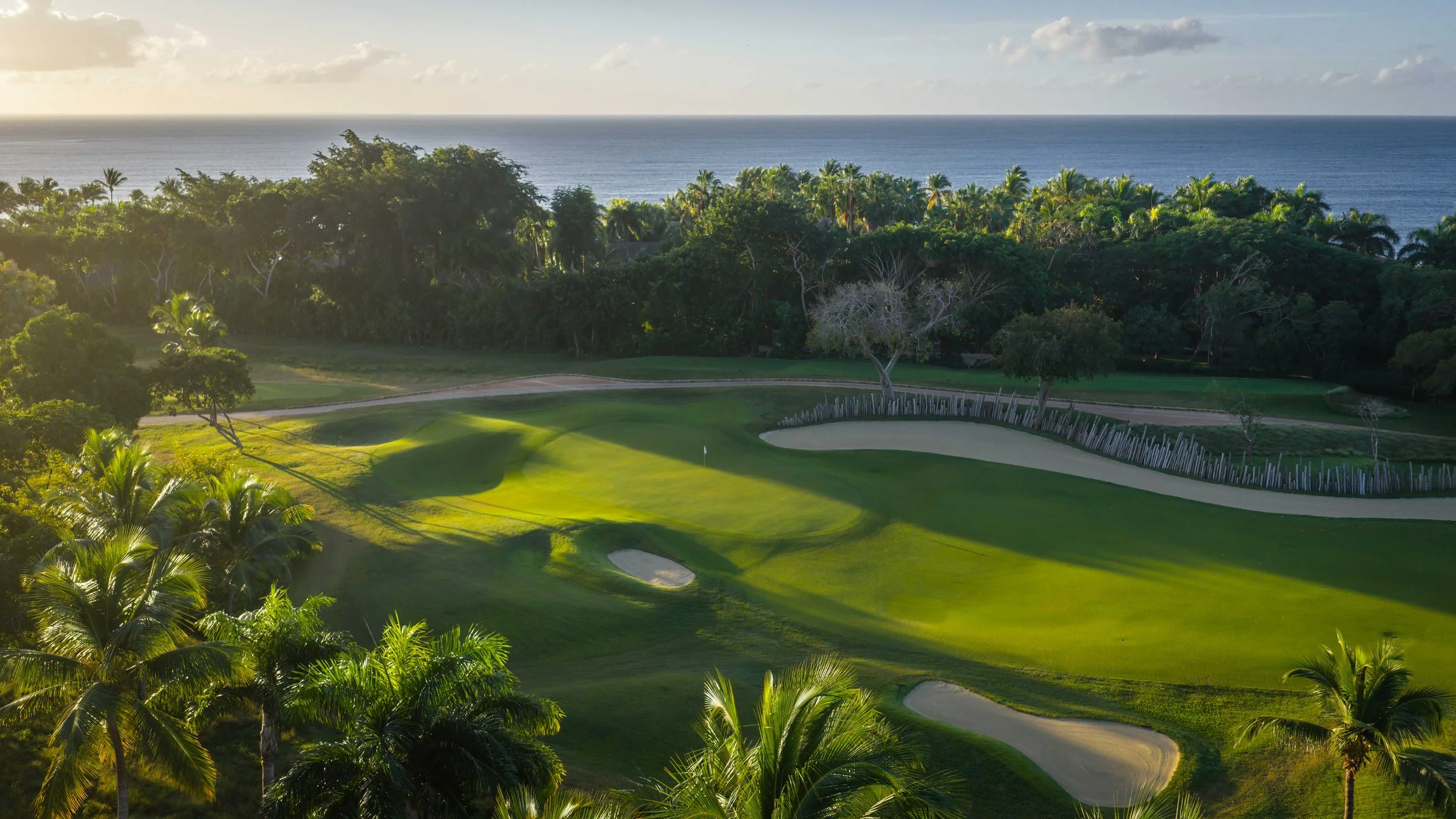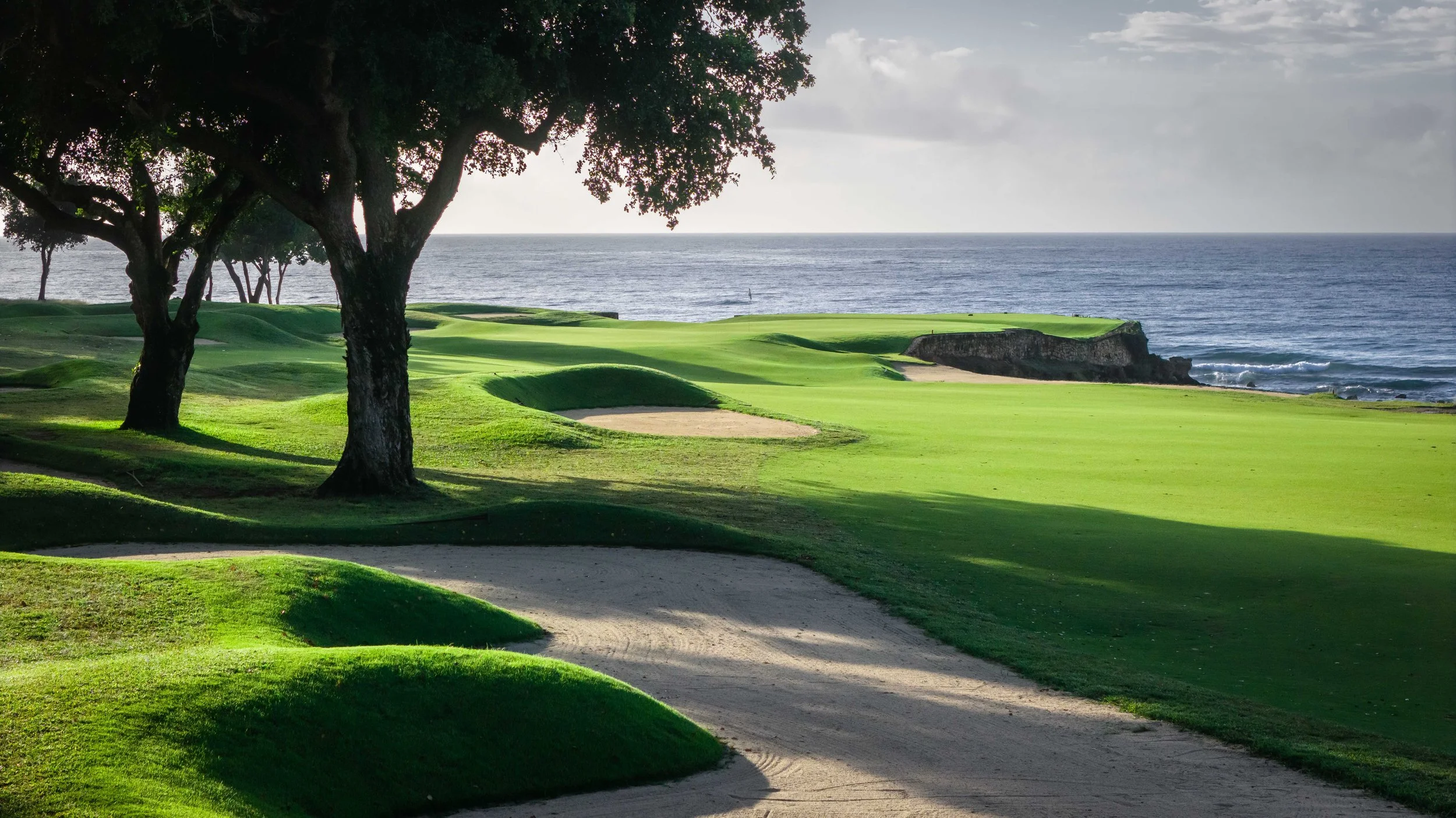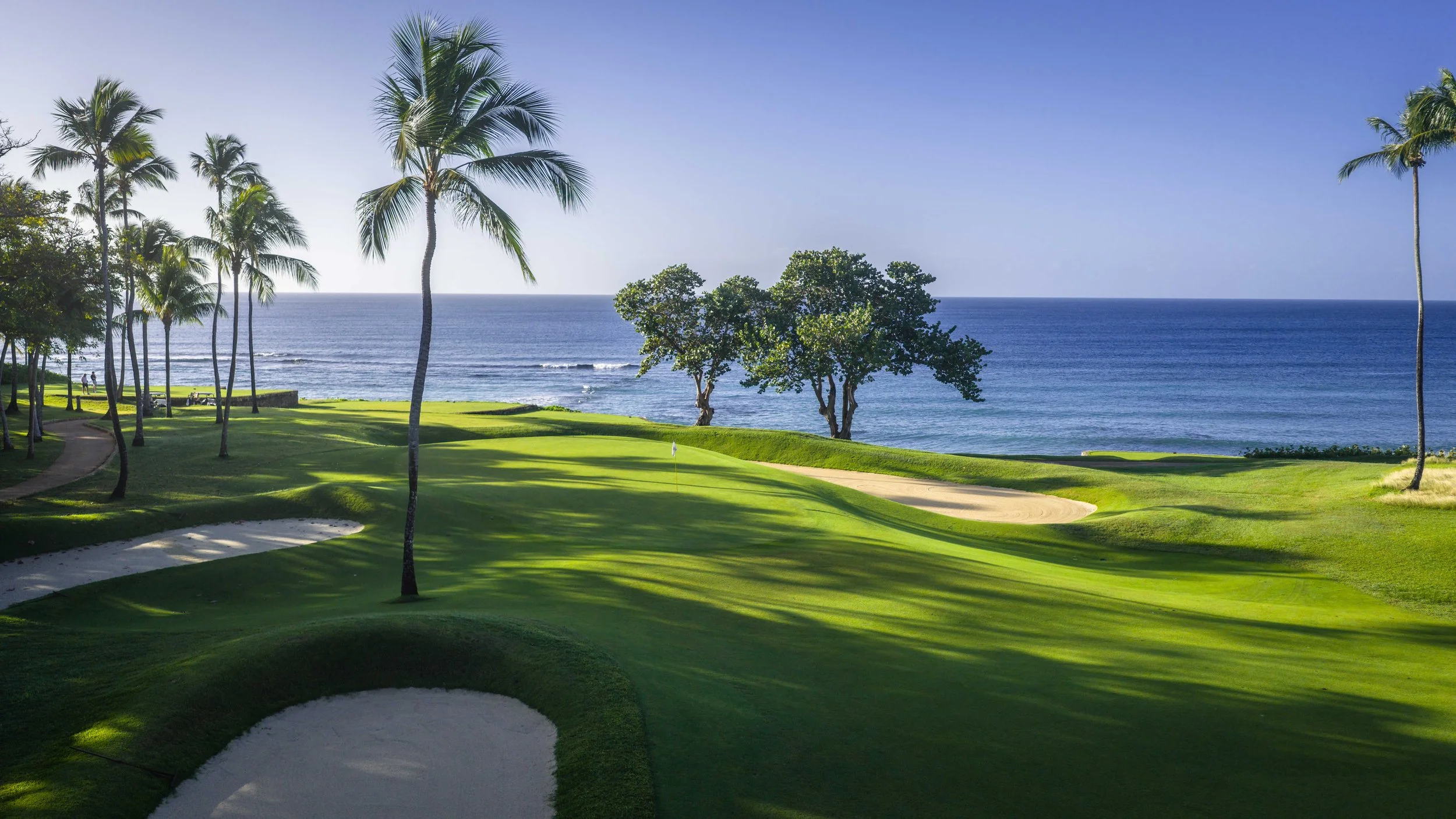 A short walk beyond the 5th green is the glorious 6th tee box. The new tee boxes have been shuffled around to provide an even more dramatic tee shot down the coastline. You can bail out to the right, but that only makes your approach shot more difficult. The green has a beautiful smattering of palm trees that can provide some interest to any golf shot that doesn’t find the putting surface.