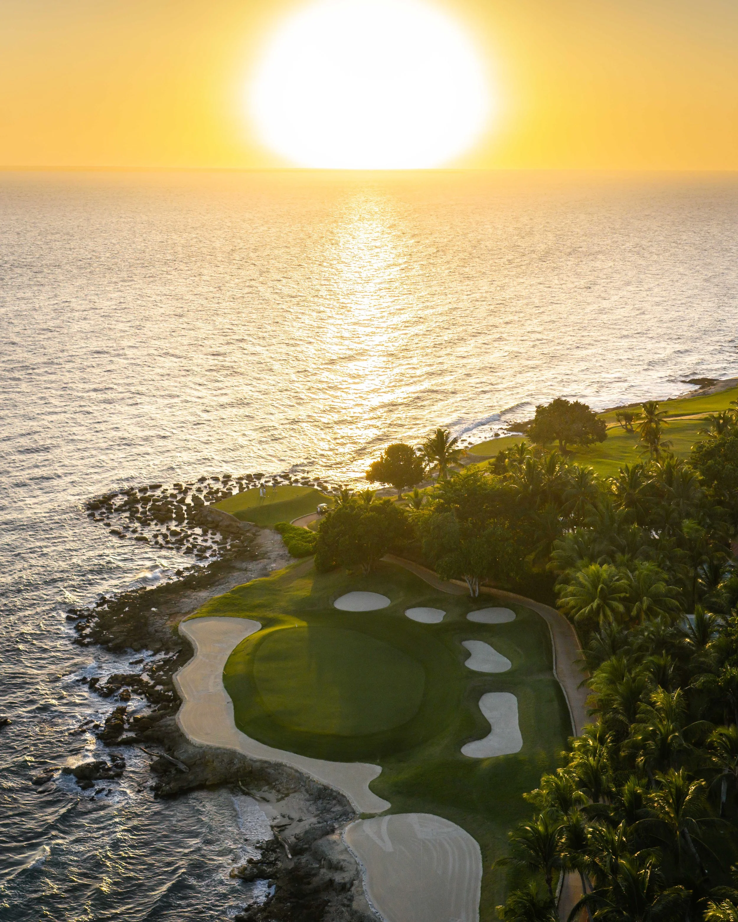 A jungle enclosed cart path leads you away from the 14th green and toward the Teeth’s biggest reveal. The moment that you pop out of the tunnel and onto the 15th tee box is one of the golf course’s most beautiful moments. It is not quite the 15th at Cypress Point, but it evokes a similar excitement. You don’t need driver from the tee box and most golfers will face a short iron into one of the world’s most glorious green sites.